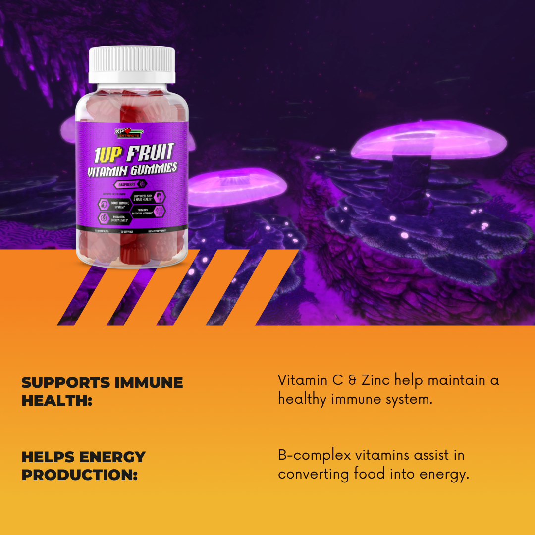 No pills, no hassle—just grab a gummy and enjoy! Take your daily vitamins the fun way and power up with 1-Up Fruit Vitamin Gummies today!