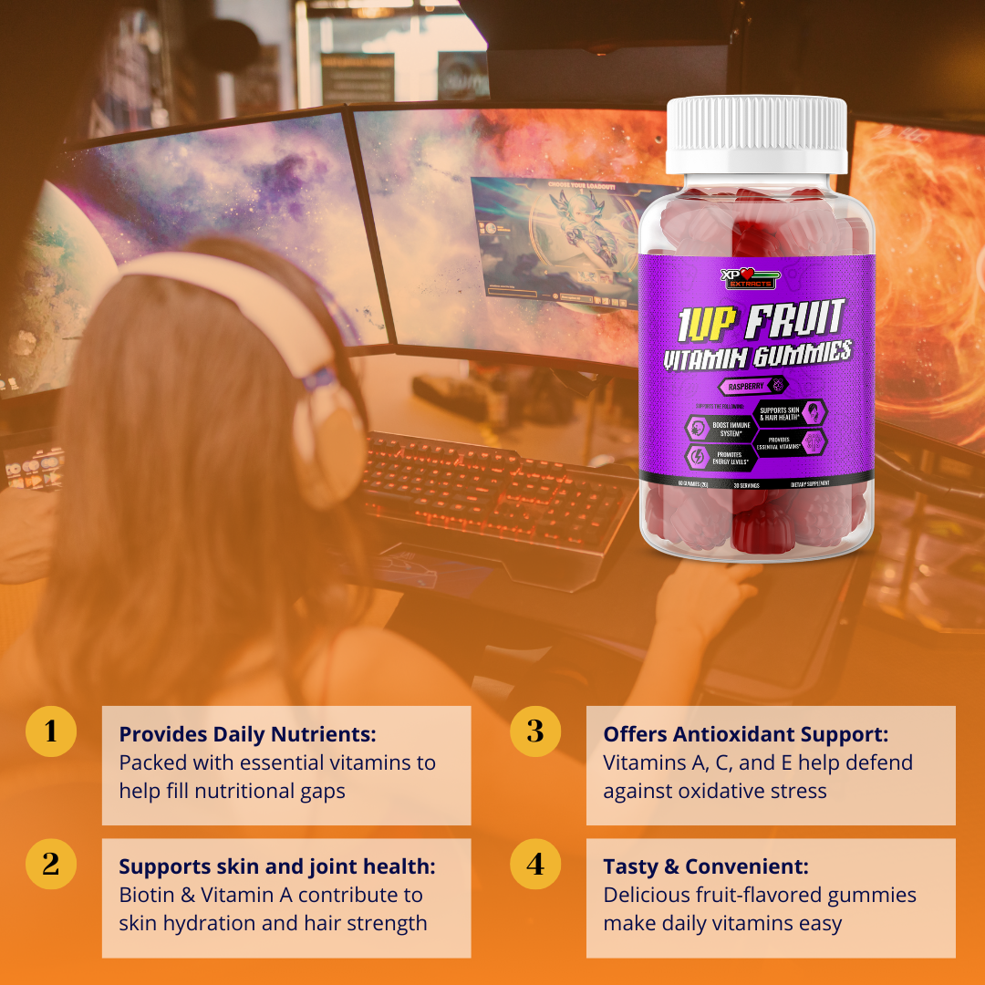 Stay energized and ready for every adventure with 1-Up Fruit Vitamin Gummies! Packed with essential vitamins like A, C, E, Biotin, and Zinc, these delicious fruit-flavored gummies help support immune health, energy production, and overall wellness—all in a convenient, easy-to-take formula. Whether you're gaming, working, or just tackling your daily routine, these gummies help you stay on top of your game.