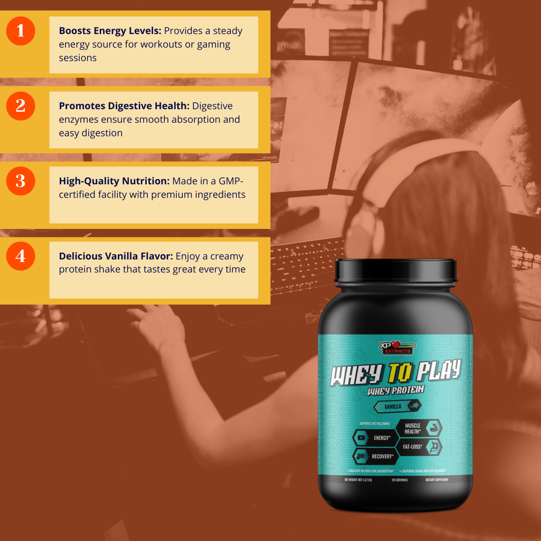 Do you need a quick, easy way to boost your protein intake after workouts or gaming marathons? Are you looking for a supplement that not only supports muscle recovery but also helps keep your energy levels high throughout the day? Whey to Play is designed to give your body the protein and nutrients it needs to stay strong and energized, helping you stay at the top of your game.